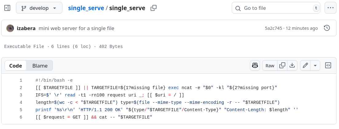 i needed to share a single file so i wrote a quick webserver in bash like any normal person would. it supports head and get, which was all i needed. as far as i’m aware it doesn’t misbehave too badly