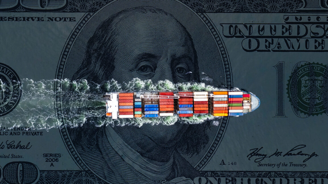 Container ship at sea on 100 dollar bill background